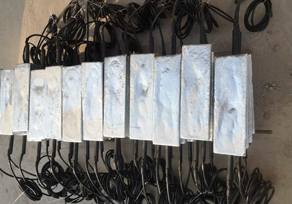根據(jù)電化學(xué)原理,從鎂合金陽極材料體上通過土壤、水等電解質(zhì)向被保護體如鋼質(zhì)結(jié)構(gòu)提供陰極電流,使被保護的鋼質(zhì)結(jié)構(gòu)進行陰極化,實現(xiàn)陰極保護。隨著電流的不斷流動,陽極材料不斷消耗掉。這就是犧牲陽極名稱的由來?!〕商祖V犧牲陽極,由鎂犧牲陽極錠1支,一根VV-10㎜2電纜3米,填包料50kg,棉布口袋1條,塑料編織袋1條組成。即棉布口袋內(nèi)有鎂犧牲陽極錠1支其鐵芯上焊VV-10㎜2電纜3米1根,焊接處做絕緣處理,并套有熱縮管。鎂犧牲陽極錠周圍均勻分布50kg填包料。棉布口袋外套塑料編織袋1條。