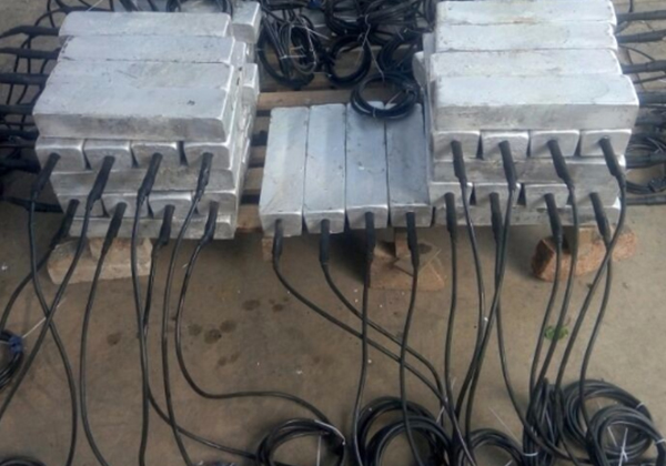 以上的鎂合金犧牲陽(yáng)極也可以經(jīng)組裝后提供給客戶。裸陽(yáng)極首先和電纜連接,連接部位 用環(huán)氧樹(shù)脂密封。然后加填充料封裝在棉布袋里。
